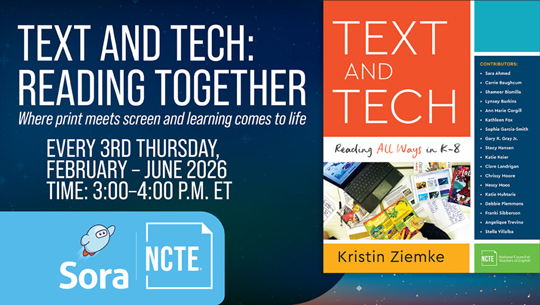 Join a new interactive monthly webinar series co-produced by the National Council of Teachers of English and the Sora reading platform. Each session offers a deep dive into Text and Tech: Reading All Ways in K-8, with insights from contributing authors who will help unpack each chapter and share practical strategies, classroom applications, and live discussion. Attendees will walk away with new strategies to help them create a balanced, student-centered approach to literacy, where print and digital tools work hand-in-hand.